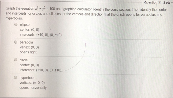 Solved Question 31 2 Pts Graph The Equation X2 Y 100 On A Chegg Com